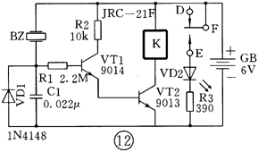 继电器电路 见图9 。继电器K选用JRC—21F等超小型弱功率电磁继电器,线圈电压选6V,消耗功率0.36W。由于继电器线圈工作电流60mA,比玩具电动机工作电流小,比蜂鸣器、发光二极管工作电流大,因此设计电路时各元件参数介于两者之间,图中参数供参考。在图9继电器电路中,F为衔铁,D为常闭触点,E为常开触点。当控制开关S闭合时,继电器吸合,常开触点F-E接通,发光二极管VD1点亮,R2为限流电阻器。图9控制开关S换成干簧管开关、双金属复片开关,就可以进行磁控和热控自动控制了。继电器触点可以根据需要选用常开或常闭触点。由于继电器触点与传感控制电路隔离,选用JRX型继电器,其触点可以接220V交流电,直接驱动交流电用电器。这些简单的自动控制器有什么用途呢?比如,利用荧(日)光灯中启辉器中的双金属复片,改制成可控温度传感器,制作成简易电子恒温箱、酸奶器,甚至炕头孵化鸡蛋的过热、过冷报警器等。 继电器自动控制电路 如图10~12所示。其中,图10为继电器光控电路,图11为继电器湿度控制电路,图12为继电器压力控制电路。在图12中,BZ为压电陶瓷片,此时做为压力传感器,敲击时能够产生正、负尖顶脉冲电信号,加到控制电路输入端,二极管VD1为负尖顶脉冲电流提供通路。电阻器R1和电容器C1组成充放电电路,以增加正向脉冲宽度,延长继电器吸合的时间。实验时,对压电陶瓷片突然施加或减少压力时,继电器都会吸合、发光二极管点亮一次。如果将图12改装成声控电路,还需要把压电陶瓷片声音传感器产生微弱的电信号进行放大,才能够驱动继电器电路工作。