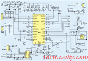 此外,该方案还具有以下一些特别功能。 1. 支持音频FM调制器控制:方便车载使用,用户不需改动汽车音响,也可享受高质音响效果(用FM收音机无线接收TV伴音);不看电视时,也可将其它音源,如VCD/DVD/MP3等,输入到FM调制器中,用汽车音响收听。 2.支持汽车倒车后视自动控制:司机倒车时,无论液晶电视处于什么状态,均自动转到AV2,连接汽车后视摄像头,监控倒车状况;当倒车操作结束,液晶电视自动返回先前状态TV或AV1。 3.16:9/4:3图像模式转换控制。 图2:LCD TV方案中的SP633及其外围控制电路图。 (点击看大图)