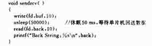 初始化以后就开始发送和接收数据,先将一个字符串发送给单片机,单片机接收到数据后,将数据返回给上位机。但需要注意的是,由于上位机速度比单片机快得多,一次不能发送过多的数据,否则极有可能使发送缓冲区溢出而丢失数据,发送过后,还需等待一段时间,使单片机将数据完全发送到上位机后,再进行读取。